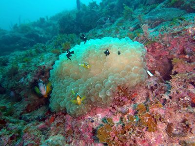 それから、さらに上段の根の上にあがると、メゾンドクマノミ発見──イソギンチャクの群生です。